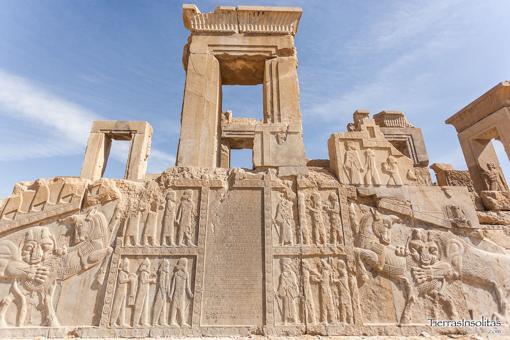 Sobre los accesos a las necrópolis también podemos ver diferentes relieves, parecidos a los que encontramos en Persépolis. El precio para poder ver las tumbas es de 200.000 IRR (4,20€).