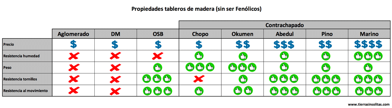 Otra alternativa que he encontrado recientemente es el tablero de OSB. Las prestaciones son las mismas que con un contrachapado pero a la mitad de precio. Tener en cuenta que el OSB no acepta bien la humedad por lo que nuestro tablero deberá ser fenólico.