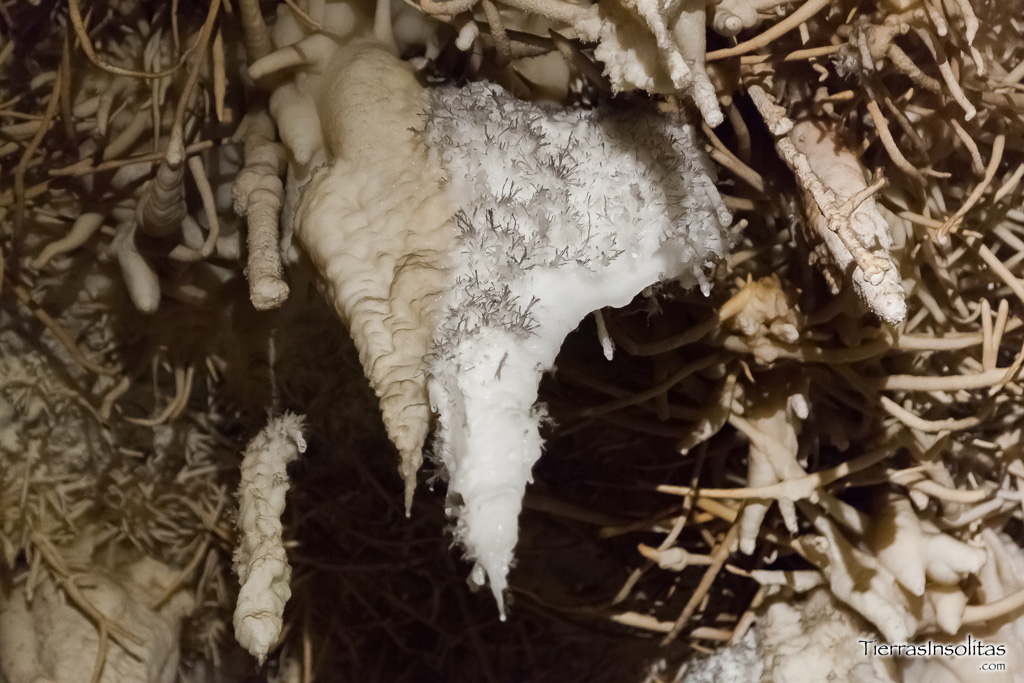 Éstas estalactitas excéntricas son curiosas formaciones que desafían la gravedad. Pequeñas ramificaciones que se han formado en todas direcciones a lo largo de millones de años, cuyas formas nos pueden recordar a caprichosas raíces que se entrelazan. Nos llama mucho la atención la longitud de éstas excéntricas siendo, posiblemente, las únicas del mundo con éstos tamaños.