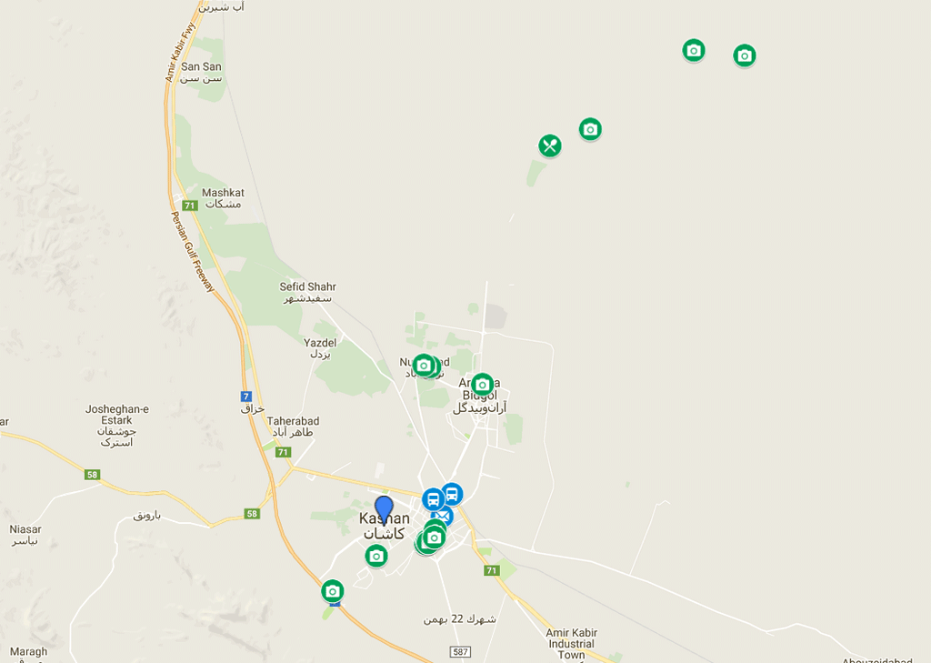 En Kashan nos bajamos en una rotonda cercana a la estación de autobuses, al norte de la ciudad. Aquí nos abordaron un montón de taxistas (80.000 IRR al centro). El taxista que nos cogió fue el que nos recomendó el hotel y nos vendió la ruta por las afueras de Kashan.