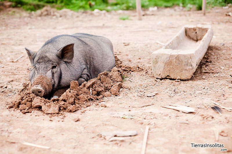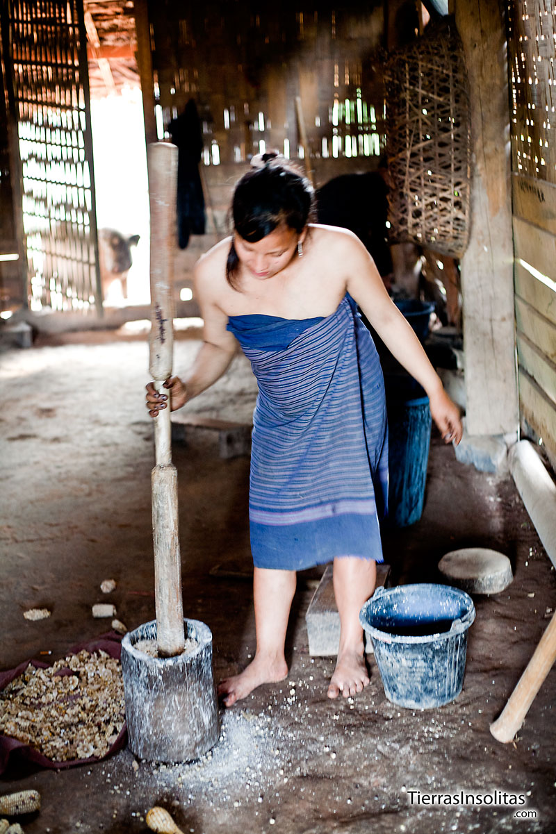 Hay que darles de comer. La comida que les dan a los animales son básicamente cereales y agua. Ese es el alimento esencial. Para ello, tienen que moler los granos de las mazorcas de maíz para que se puedan digerir sin problemas. Como no hay un molino que haga el trabajo duro, las mujeres muelen los granos de maíz a base de machacarlos con un mortero gigante que pesa un montón, aunque a simple vista no lo parezca. Es un trabajo duro.
