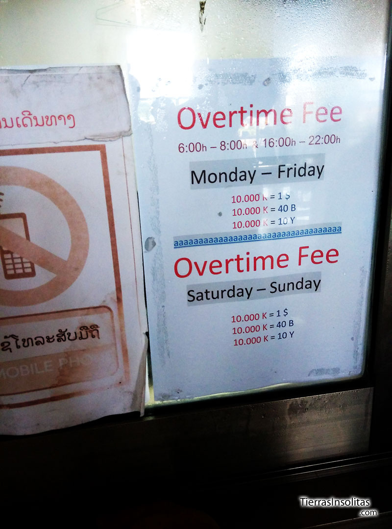 Para cruzar la frontera hacia Tailandia es muy sencillo. El autobús te deja justo en la entrada y sólo hay que seguir las señales. En teoría la frontera sólo está abierta entre las 8 de la mañana y las 16 horas. Realmente no es así. La frontera está abierta desde las 6 de la mañana hasta las 22 horas, sólo que de 6 a 8 y de 16 a 22, hay que pagar una tasa para poder cruzar. En la siguiente foto lo veréis mejor.