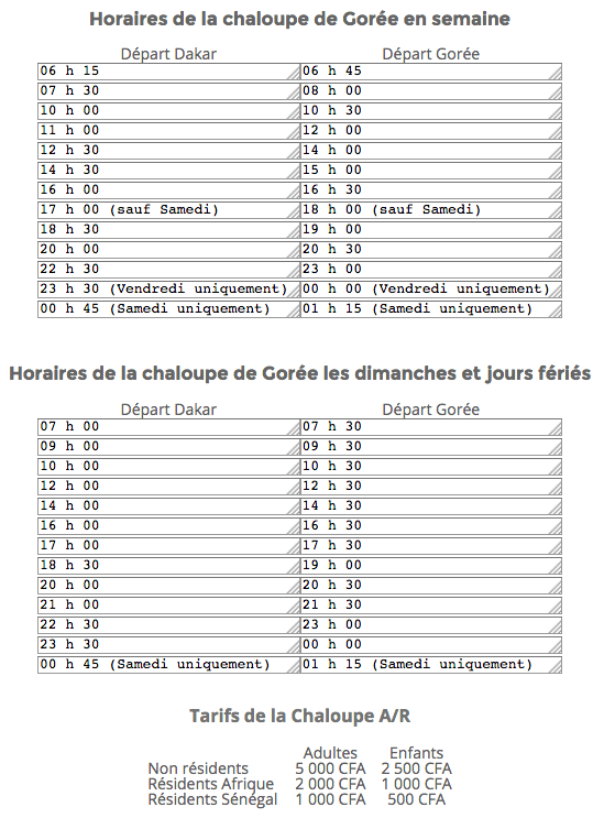 Todos los días parten ferrys desde el puerto de Dakar hasta la isla Gorée. Al encontrarse a tan solo 3 km de distancia, el trayecto apenas dura 30 minutos. El billete ida y vuelta cuesta 5.200 CFA para los extranjeros.