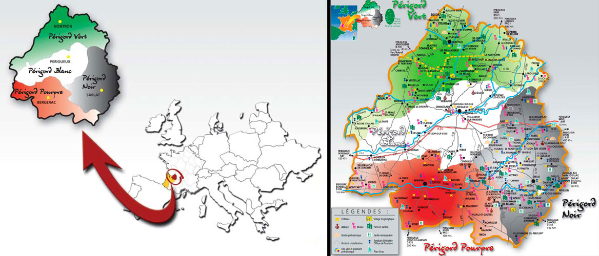 Para entender mejor que es el Périgord hay que remontarse unos años atrás. Antiguamente era una provincia del suroeste de Francia, la cual se convirtió en 1790 en el actual departamento de Dordoña (Dordogne). Turisticamente podemos oír que se le asigna el nombre de Dordoña Périgord, el cual se ha dividido a si misma en cuatro zonas para su promoción turística: